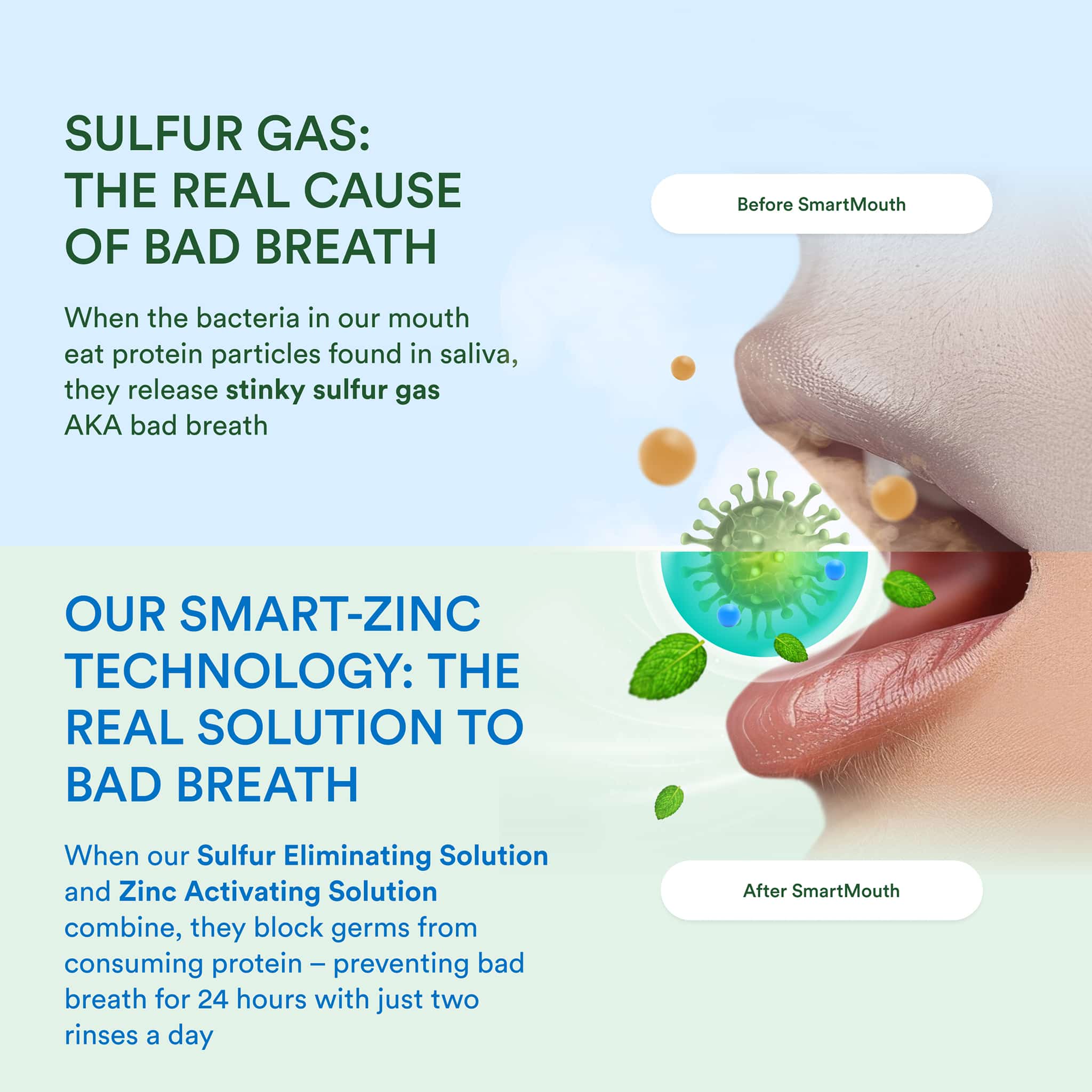 The Science Behind Fresh Breathu003c/h2u003ernSmartMouth™ is not your ordinary mouthwash for bad breath. What sets it apart is our patented zinc ion technology, contained within our Original Activated Breath Rinse. This technology activates as you mix Solution 1 and Solution 2, producing a powerful zinc ion solution scientifically proven to neutralize the sulfur gases that cause bad breath. By addressing bad breath at its source, SmartMouth™ ensures that once your breath is fresh, it remains that way throughout the day and night.rnrnWhen it comes to bad breath prevention mouthwash, SmartMouth™ stands unrivaled. Our commitment to quality and science-backed solutions means that each bottle of SmartMouth™ Original Activated Breath Rinse is designed to give you confidence in every smile and conversation.