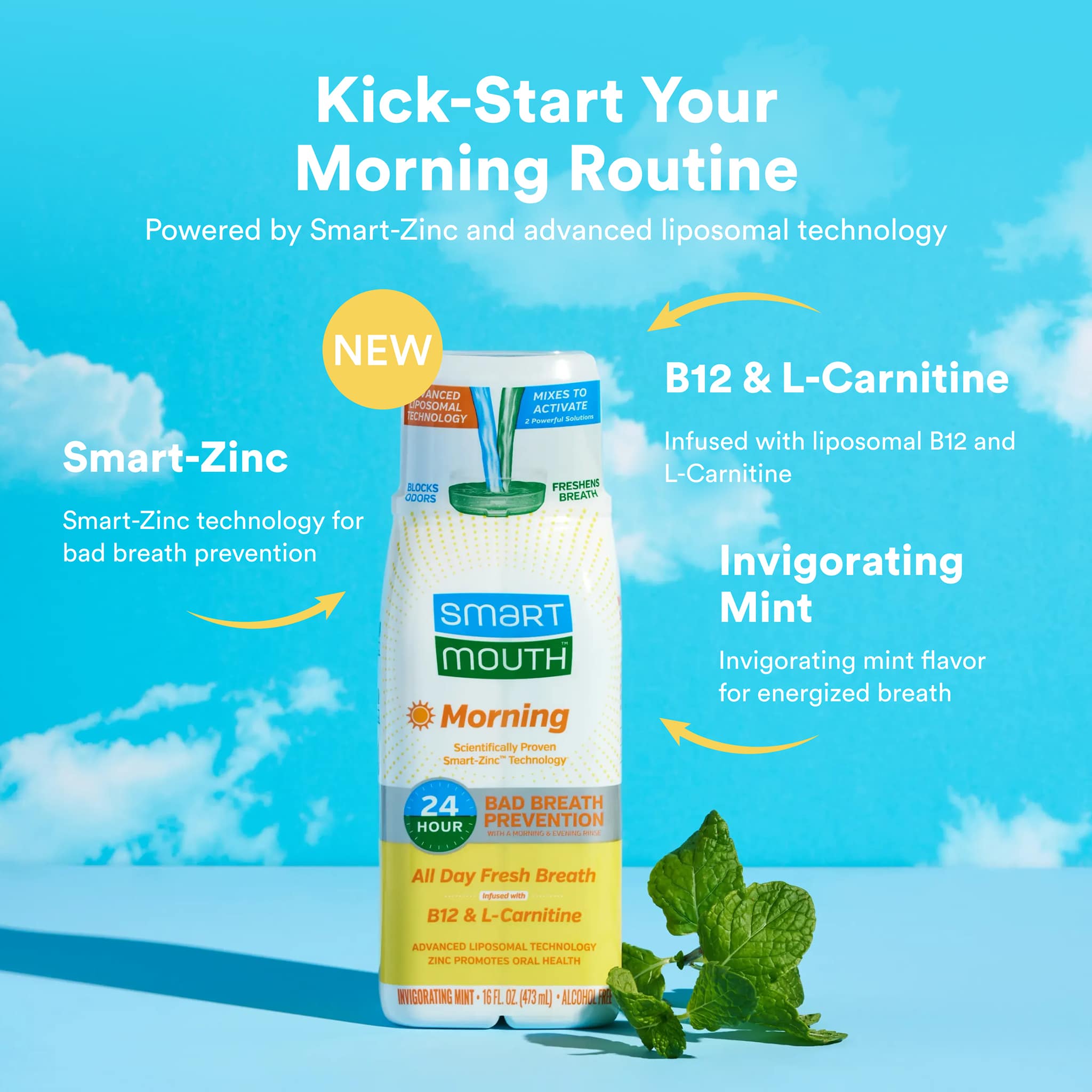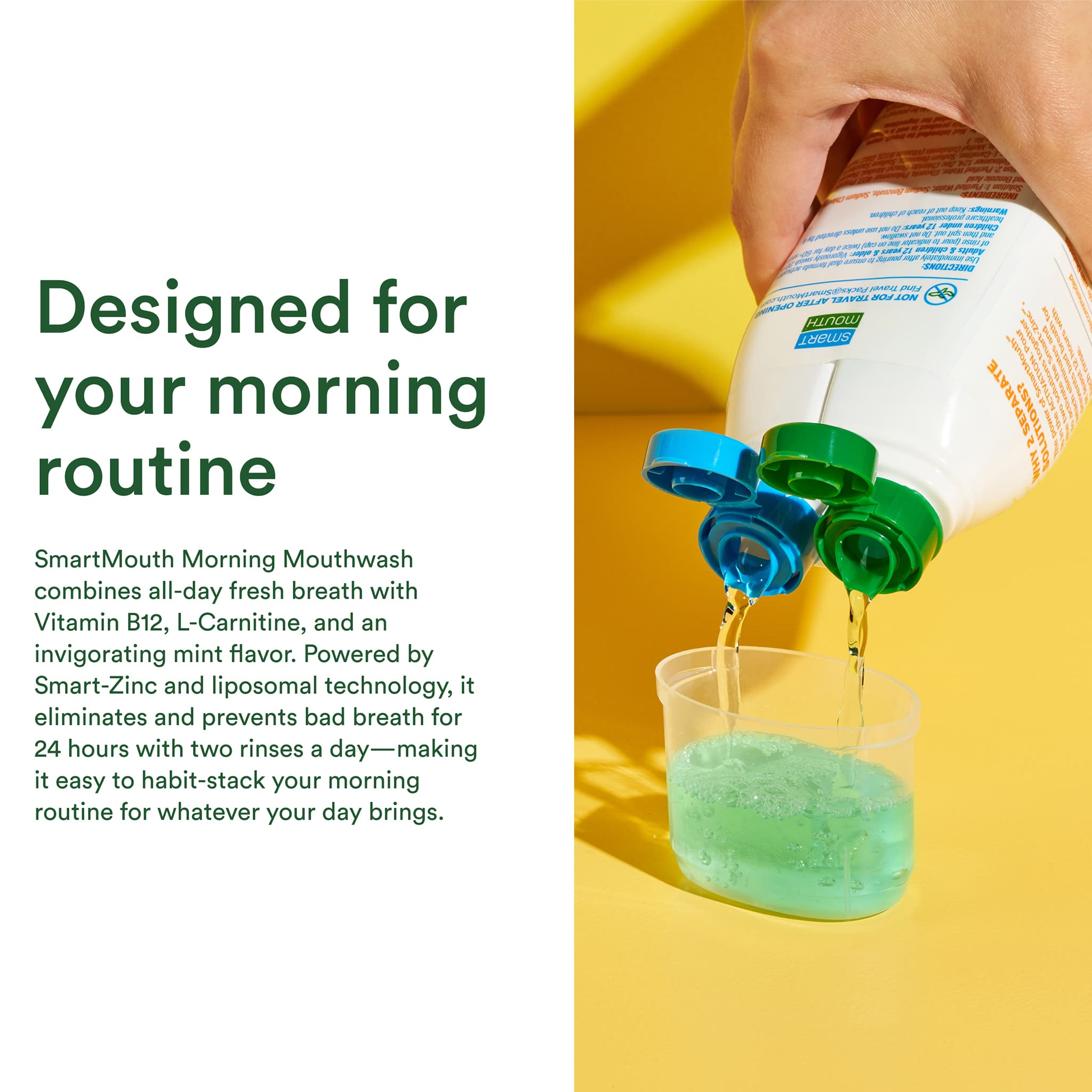 Designed specifically for your morning routine, SmartMouth Morning Mouthwash combines all-day fresh breath with Vitamin B12 and L-Carnitine and an invigorating mint flavor. Powered by Smart-Zinc and liposomal technology, it eliminates and prevents bad breath for 24 hours with two rinses a day — making it easy to habit-stack your morning routine for whatever your day brings.