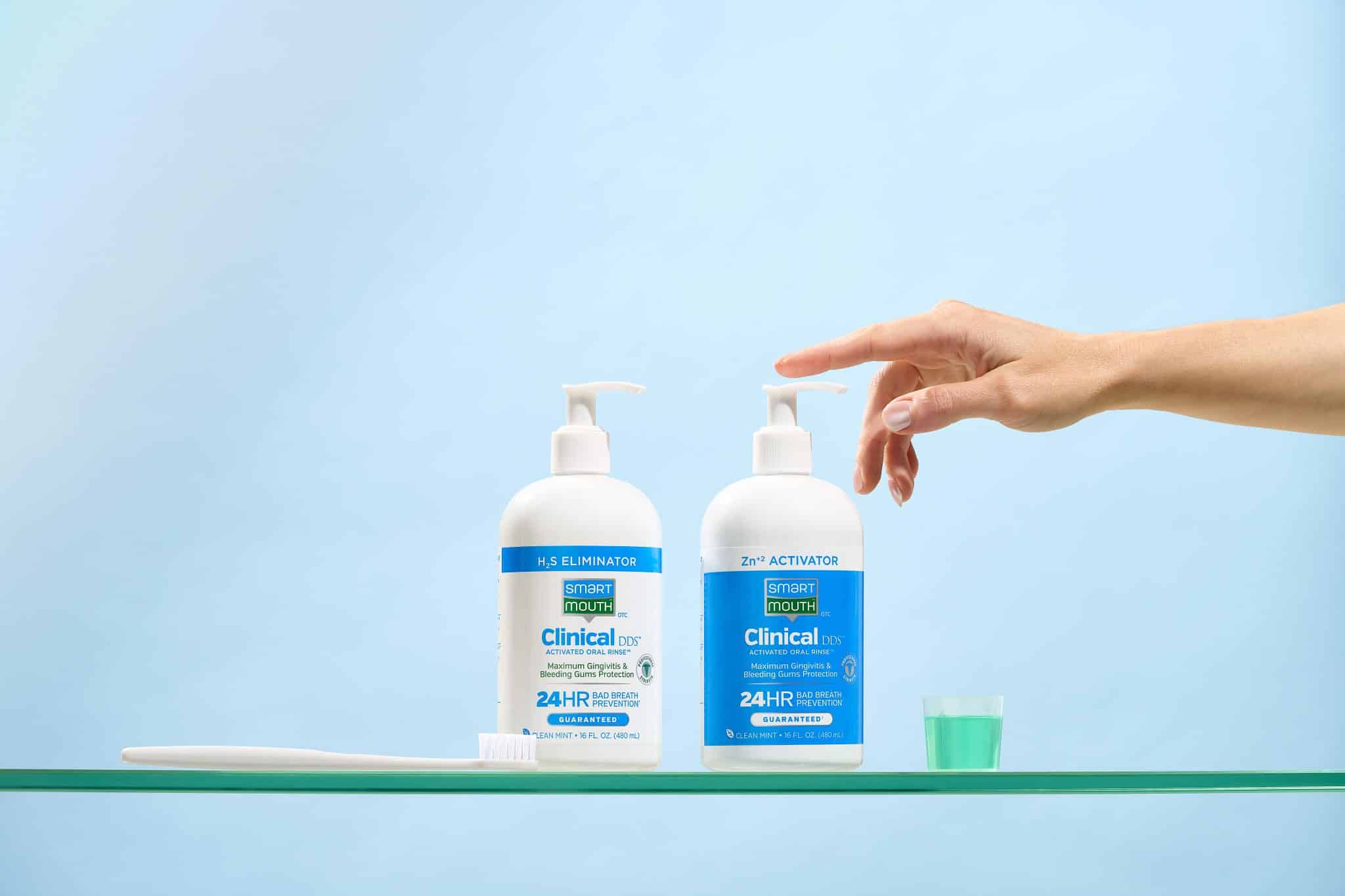 SmartMouth™ Clinical DDS 2-Bottle Activated Mouthwash System delivers a full month of clinical-strength fresh breath protection in convenient pump bottles. Each 32oz bottle set keeps the Sulfur Eliminator and Zinc Ion Activator separate until it’s time to mix and rinse, ensuring maximum effectiveness every time. SmartMouth™ Clinical DDS Activated Oral Rinse combines zinc ion technology with maximum anti-plaque and anti-gingivitis benefits to help prevent bleeding gums. This patented solution eliminates bad breath and prevents it from returning for 24 hours with twice daily use. SmartMouth™ Clinical DDS is an OTC substitute for prescription chlorhexidine rinse. Unlike prescription chlorhexidine, SmartMouth™ does not cause chlorhexidine staining, has zero alcohol, and is always paraben free.