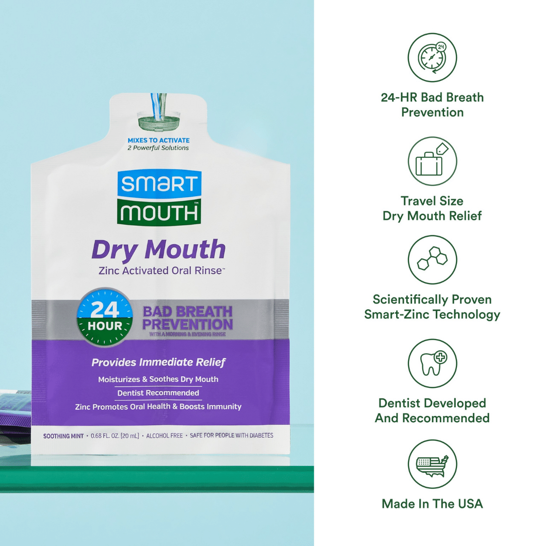 SmartMouth™ Dry Mouth Activated Single Packs make it easy to get dry mouth relief and fresh breath anytime, anywhere. Each TSA-friendly packet keeps the two solutions separate until you’re ready to rinse, delivering instant moisture, lasting comfort, and bad breath prevention. Lightweight and portable — perfect for your purse, luggage, briefcase, or pocket.